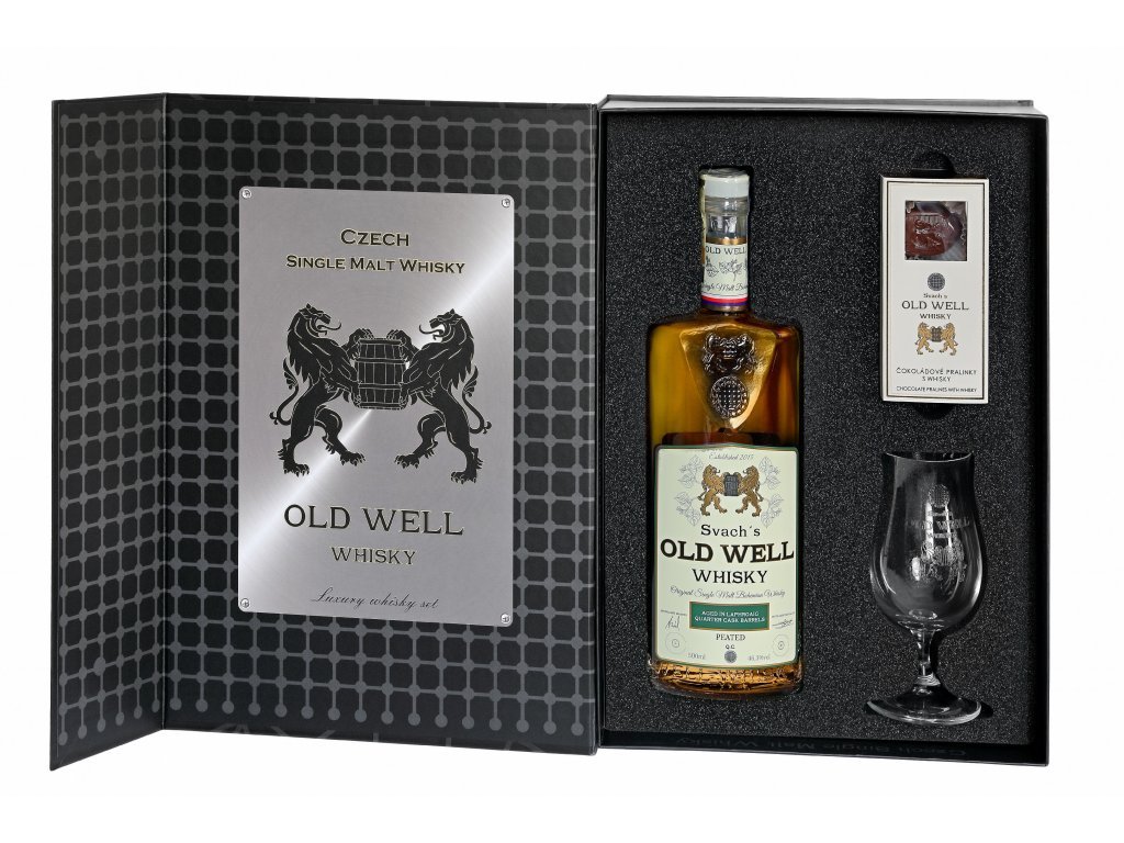 Krásná dárková kazeta s magnetovým uzávěrem obsahuje sadu Svach´s Old Well whisky, degustační skleničku a krabičku se 3 čerstvými pralinkami s whisky ganáží.