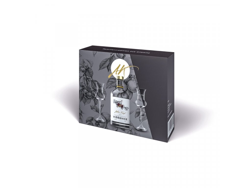 Luxusní dárková balení tzv. klapboxy z tvrdého papíru tloušťky 1,4 mm s ofsetovým barevným tiskem a matnou laminací naplněné lahví našeho kvalitního destilátu a degustačními skleničkami z českého skla. Destilát je vyroben alkoholovým kvašením a destilací višní a naředěn měkkou demineralizovanou vodou ze 102 metrů hlubokého vrtu v klikovském souvrství Třeboňské pánve. Bez dalších přísad.